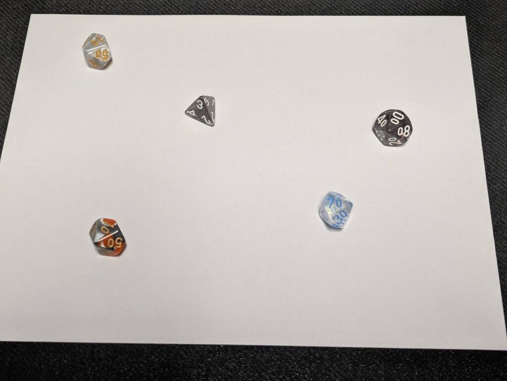 First thing, I decided how many continents I wanted my world to have. I settled on four. So, I took four d10s (or d% in the picture) to determine how big those continents would be. I also dropped a d4 in there to decide on the world’s overall environment per the Global Environment table. Note that my table has rows for up to 8, with each increase in die type offering more exotic world possibilities. I wanted something reasonably Earth-like, so I stuck with just the d4.