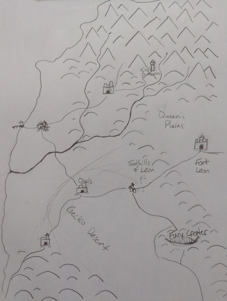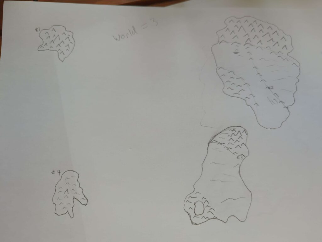 Finally, it was time to put the continents together on the single page world map. With these being hastily drawn (and my not being a refined cartographer just yet), they’re not perfect reflections of the other work, but they work as placeholders until I start to develop the regions. Ultimately, once the world is better established, it would be ideal to remake these maps in a digital medium where the work at one scale can be copied directly into a map of another scale, or at least copied in such a way to ensure better consistency between the scaled maps.
